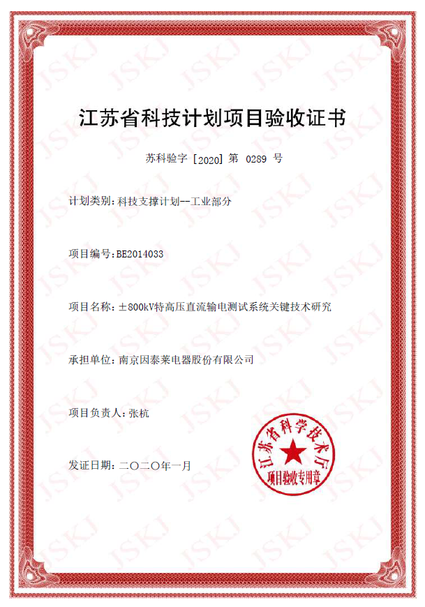 新年伊始,萬象更新!日前,南京因泰萊承擔(dān)的江蘇省科技支撐計劃項目“±800kV特高壓直流輸電測試系統(tǒng)關(guān)鍵技術(shù)研究”順利通過江蘇省科技計劃項目驗收并獲得證書。 2019年,…